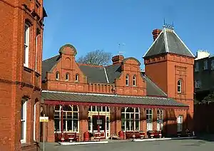 The main entrance to the station is via a grand archway at the junction of Peel Road and Athol Street. This has two gilt-topped turrets and clock tower, between which are a set of steps descending to the station. These gates are usually closed, but there is a smaller gate on the left side of the structure which provides pedestrian access from Athol Street and the financial district. A second entrance at the bottom of the hill from North Quay provides level/vehicular access to the station. Entering down the Peel Road steps, the visitor is faced with two large Ruabon brick buildings. The building ahead of the visitor, which is now used as the Customs House, was constructed as the railway's administrative offices in 1887, and also accommodated, on the ground floor, the Ladies' Waiting Room and lavatory, a licensed refreshment room, and bar. The building to the visitor's right is main station building which originally housed the booking hall, ticket office, parcels office, porters' room, stationmaster's office, to provide storage for millions of card tickets and railway records. This building was designed in 1888, but not constructed until 1891/2, following the abandonment of plans for a steam railway from Douglas, via Quarter Bridge to Onchan and Laxey. The present iron and glass canopy across the front of the building was added in 1909. It now houses a restaurant, installed during extensive interior works in 1991, the booking/stationmasters' office, and a tiny passenger waiting area. The former parcels office was adapted to provide management offices in 1979/80, but has been vacant since management were relocated following the completion of IOM Transport's Banks Circus Headquarters on the site of the carriage shed in 1999. The now vacant upper floor was added to the office area at the north end of the building in 1979, and involved the introduction of a staircase into the building which now divides the original ticket office into two. At the same time, the booking hall floor was sealed using a resin material slightly raising the floor level, and when the mezzanine and kitchen area were installed in 1990/1 a new wooden floor was laid on top of the original raising the floor level by a further 40mm. At the same time, the 1920s ticket window, and 1979 souvenir shop in the centre of the booking hall were removed. In recent years, the north end of the building has experience subsidence due to the presence of a main sewer at that end of the building, and there has been considerable deterioration of the disused office area at the north end of the building. In 2011, a major restoration scheme to underpin the north end of the building repair the roof, and possibly rebuild the old canopy over the circulating area was announced. Roof repairs were completed in 2013, but the rest of the scheme was subjected to a review, the results of which are discussed below. In the active part of the building, seating for the restaurant has increasingly encroached on the passenger facilities within the Booking Hall, and as of September 2014 there is no dedicated seating area for passengers apart from a handful of seats by the door out to the circulating area!