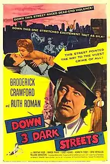 Down Three Dark Streets is a 1954 American film noir crime film directed by Arnold Laven and starring Broderick Crawford and Ruth Roman. The screenplay was written by Gordon Gordon and Mildred Gordon, based on their novel Case File FBI.[1]