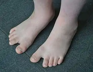 Feet of a boy with Down syndrome, showing the deviated first toes