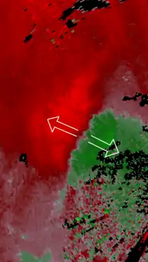 On a weather radar Doppler display, a downburst is seen as a couplet of radial winds in the outburst and cushion stages. The rightmost image shows such a display from the ARMOR Doppler Weather Radar in Huntsville, Alabama in 2012. The radar is on the right side of the image and the downburst is along the line separating the velocity towards the radar (green), and the one moving away (red).