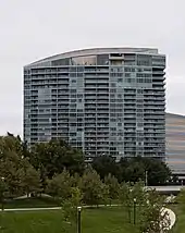 Miranova Place is located within the southwestern corner of downtown. It is bordered by the Scioto River to the north and west, Interstate 70 to the south, and South Civic Center Drive to the east.[21] Within it lies two major features, the Miranova Condominiums and the Miranova Corporate Tower. The condominiums are a 26-floor residential unit, finished in 2000.[22] The Miranova Corporate Tower is a 12-floor corporate office space that was finished in 2001.[23] The buildings designs reflect a modern architecture meant to serve as a bookend for downtown before it reached the Scioto River and I-70.[24] The buildings are owned by developer Ron Pizutti, and serve currently as his headquarters.