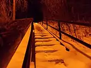 Downtown Minot is located in the Souris River Valley between North Hill and South Hill along US Route 83. The neighborhood is roughly bound by Fifth Avenue South to the south, Fifth Street Southwest to the west, CP's railroad tracks to the north and Front Street to the east.[4] The major streets through downtown include Broadway (formerly Second Street West), the Burdick Expressway (Business US 2/52), Main Street and Central Avenue. Main Street and Central Avenue divide the city's street into four quadrants. Streets east of Main Street are designated east, while streets west of Main Street are designated west. Likewise, streets north of Central Avenue are designated north, while those to the south are designated south. Downtown is connected to the north side of the Souris River by three bridges, the Broadway Bridge and the Third Street Bridge carry automobile traffic over the railroad track and river and the Anne Street Viaduct[5] is a pedestrian bridge making this crossing. The Broadway Bridge, which carries US 83 across the river, was completed in 1962.[6] The First Avenue Pedestrian Bridge over the Souris River, built in 1935,[7] connects downtown with the Torbenson neighborhood.[8] The Eastwood Park Bridge is a pedestrian bridge over the Eastwood Oxbow, which connects downtown with the Eastwood Park neighborhood. The Eastwood Park Bridge, a false arch bridge built in 1927, carries Sixth Street from Central Avenue to First Avenue SE.[9] The First Street Stairs is a set of stairs connecting two sections of First Street and downtown with South Hill.