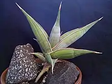 Leaf cutting is typically used once rosettes have already flowered, in which case they will no longer grow. Whole leaves can be cut from the rosette and set aside for several days to allow the cut to dry. At this point the leaf can be inserted cut-side down into moist porous potting medium to root. Over time, the leaf will produce roots and a stolon from the cut which will bear a new plant at its tip. Since variegation is produced through rare somatic mutations in the apical meristem, this is the preferred method for generating variegated specimens due to the volume of leaves which can be rooted simultaneously.