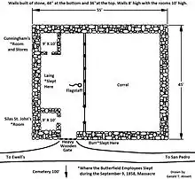 Dragoon Springs Stage Station was the second of the two stone fortified stations constructed in Arizona and was the last going west on the 2,700 mile trail from Tipton, Missouri, to San Francisco, California. A six-year mail contract, No. 12,578, was awarded to John Butterfield to start on September 1858 and end on September 15, 1864.[3] [4] [5] This station was built in August and early September 1858 by Butterfield's Overland Mail Company to house employees and livestock. The construction of the station was supervised by Butterfield Division Superintendent William Buckley of Watertown, New York.[6]