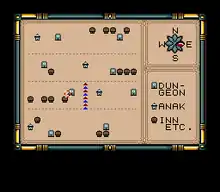 Drakkhen's gameplay is colored by its early-game brutality and surreal enemy encounters, the former especially in the SNES version. One special enemy is relegated solely to appearing when the player kicks one of the many urns in the ground. Upon doing so, a black, stationary canine head rises from beneath the floor to shoot bolts from its eyes. These encounters are quickly fatal to new players who don't know any better.[4] They offer no experience points, suggesting that kicking an urn is frowned upon. Another difficult enemy is the "Shadow Man", a tall figure that can unexpectedly lift itself out of the ground, accompanied by an ominous tune. Each enemy has movement and attack differences, some being less subtle than others, such as enemies that zigzag sporadically at a much greater speed than the player's party can keep up with. The game contains over one hundred different enemy variants.[5]