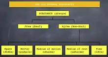 Dravya (Sanskrit: द्रव्य) means substance or entity. According to the Jain philosophy, the universe is made up of six eternal substances: sentient beings or souls (jīva), non-sentient substance or matter (pudgala), principle of motion (dharma), the principle of rest (adharma), space (ākāśa) and time (kāla).[1][2] The latter five are united as the ajiva (the non-living). As per the Sanskrit etymology, dravya means substances or entity, but it may also mean real or fundamental categories.[2]