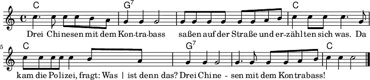 "Drei Chinesen mit dem Kontrabass" (Three Chinese or Chinamen With A Double Bass) is a popular nonsensical German children's song. Its distinctive feature is a very simple form of word play: while the lyrics remain in effect unchanged, in each consecutive stanza all the vowels are replaced by one single vowel, with that single vowel changing in each new stanza.