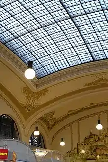 The lobby received a modern translucent roof and an Art Nouveau (Jugendstil) painting in ochre and green tones, which had been rediscovered in 1997 under layers of plaster, was reconstructed. In addition, the second-largest image ever made in Meissen porcelain (after the Fürstenzug) is now displayed on an inner wall of the entrance building. The Meissen porcelain factory created the 90 square-metre mural of 900 tiles designed by the painters Horst Brettschneider and Heinz Werner. It shows Saxony's most beautiful castles and gardens in 22 impressions.[15][16]
