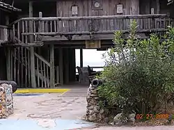 The building is distinguished by board and batten exterior walls, wood shingled gable ends with decorative truss work and rustic balcony railings. The courtyard is marked by two stone walls, into which are embedded two rusty, ancient cannons. Ceramic tiles decorate the courtyard floor. A breezeway is at the east end of the courtyard and is flanked by stairs leading to the second floor. The hallway at the north end features a small mural of a Spanish explorer landing in the new world. The breezeway walls feature graffiti from visitors, applied ornaments and portions of a wood mantel.[4]