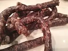 Droëwors (/ˈdruːəvɔːrs/; Afrikaans literally "dry sausage") is a Southern African snack food, based on the traditional, coriander-seed spiced boerewors sausage.[1] It is usually made as a dunwors (Afrikaans for "thin sausage") rather than dikwors ("thick sausage"), as the thinner sausage dries quicker and is thus, less likely to spoil before it can be preserved. If dikwors is to be used, it is usually flattened to provide a larger surface area for drying.