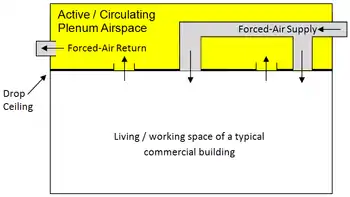 In older buildings, the space above the dropped ceiling was often used as a plenum space for ventilation systems, requiring only enclosed ducts that deliver fresh air into the room below, with return air entering the ceiling space through open grilles across the ceiling. That practice is now used less frequently in new buildings.