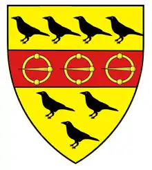 The Drugeths (or Drugets) originated from the Kingdom of France. They belonged to the escort of Charles I of Anjou, who conquered the Kingdom of Sicily in 1266. In contemporary Italian records, they were referred to as "de Druget", "Rugeth", "Truget", "Drugetus" and "de Druetto", among others.[2] 19th-century Hungarian historian József Hampel considered the Drugeths adopted their surname after a forename (Drugo, Druetto), and he assumed a relationship with the Merloto family of French origin due to the similarity of heraldic animals in their coats-of-arms.[3] Based on the narration of the 16th-century poet Johannes Bocatius, who mentioned the Drugeths' "Salernitan roots", several historians, such as István Katona, Károly Wagner and genealogist Mór Wertner refused the theory of their French origin, but archivist István Miskolczy, who conducted research in the State Archives of Naples, convincingly proved the early origin of the family in the 1930s.[3] Serbian historian Đura Hardi also argued the Drugeths belonged to those Neapolitan elite of Ultramontane (French or Provençal) origin, who arrived to Southern Italy with Charles of Anjou, because of their courtly positions which were exclusively held by non-Italian nobles during that time.[4]