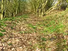The Drukken Steps therefore were stepping stones on the course of an old Road, later a Toll Road (1774), which ran from the west end of Irvine through the Eglinton policies to Kilwinning and Stevenston via Milnburn (sic) or Millburn;[11] crossing the Red burn near Knadgerhill (previously Knadgar and pronounced 'Nygerhill' as in the country.[12]) and running passed 'The Higgins' cottage, the 'Hygenhouse' of 1774,[11] now demolished. The name may be a personal name or may relate to the Scots word for a fence or hedge as the building lay close to the boundary of the estate.[13]55°37.902′N 004°39.355′W The Eglinton estate wall used to cut across the burn and join up with the perimeter wall of the cemetery. The remains of this wall can still be seen at the site of the stepping stones and it was to this wall that the original commemorative plaque had been attached. No gate or door existed here, entry being gained through a collapsed section. The nearby Knadgerhill Cemetery has one wall built from a continuation of this estate wall.
