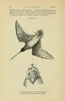 Since learning of the drumming sound that is produced by snipe, many naturalists wanted to try and explain exactly how the sound is made. Johann Friedrich Naumann was one of the many scientists interested in this task and he proposed that the drumming sound was mechanically produced by the wings.[2][4] Naumann proposed this idea around 1830, and it then became known as Naumann's Wing Theory. It was not until 1846 that an error was discovered within Naumann's theory proposal, having written schwanzfederspitsen (the German word for the tips of the tail feather) as schwingfederspitsen (which roughly translates to wing feathers).[2] This misprint led to Friedrich Wilhelm Meves to study in-depth the effects of the tail-feathers.[2] To do this, Meves attached the tail-feathers to the end of a long stick and swung both the stick and the feathers through the air, which eventually led to him concluding that the tail-feathers were in fact the producing-agents for the drumming sound.[2][5] In conducting this experiment, Meves observed that the drumming sound was only ever produced when the bird was flying in a downwards, swooping motion with its tail spread out — never when the bird was flying upwards.