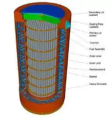 CONSTOR is a cask used for transport and long-term storage of spent fuel and high-level waste also manufactured by GNS. Its inner and outer layers are steel, enclosing a layer of concrete. A 9-meter drop test of the V/TC model was conducted in 2004; the results conformed to expectations.[18]