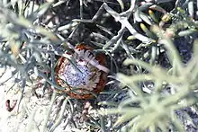 D. sect. Aphragma was retained by George Bentham in his 1870 arrangement, making it the only one of Meissner's infrageneric taxa not to be discarded. However, Bentham reasoned that the single seed separator in D. sect. Eudryandra was formed by the joining together of the outer seed coat of each seed; and therefore both D. bipinnatifida, in which there appears to be two plates, and D. sect. Aphragma, in which there appears to be none, represent failure of the seed coats to join. On these grounds he transferred D. bipinnatifida into D. sect. Aphragma. Thus D. sect. Aphragma was redefined as containing those species in which "Outer integuments of the two seeds not connate or readily separable from each other." He also noted that the members of this section have large involucres with many broad bracts, giving them "a different aspect from all others of the genus".[4]