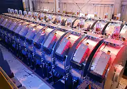 One of the design problems was designing the new induction cores to fit in the confines of the previous facility. The design team had to replace the ferrite used in the first axis cores with "metglas"—paper-thin ribbons of amorphous iron tape. The maximum magnetic field strength (saturation point) in metglas is five times higher than in ferrite. The magnetic tape was insulated by thin layers of mylar and wound up into a roll of 20,000 turns to make mammoth six-foot-diameter cores, each four inches wide and weighing more than one and a half tons. Four cores fit into each induction cell.[1]