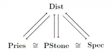 Let Dist denote the category of bounded distributive lattices and bounded lattice homomorphisms. Then the above three representations of bounded distributive lattices can be extended to dual equivalence[6] between Dist and the categories Spec, PStone, and Pries of spectral spaces with spectral maps, of pairwise Stone spaces with bi-continuous maps, and of Priestley spaces with Priestley morphisms, respectively: