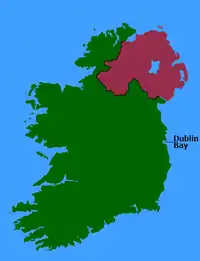 Dublin Bay (Irish: Cuan Bhaile Átha Cliath) is a C-shaped inlet of the Irish Sea on the east coast of Ireland. The bay is about 10 kilometres wide along its north–south base, and 7 km in length to its apex at the centre of the city of Dublin; stretching from Howth Head in the north to Dalkey Point in the south. North Bull Island is situated in the northwest part of the bay, where one of two major inshore sand banks lay, and features a 5 km long sandy beach, Dollymount Strand, fronting an internationally recognised wildfowl reserve. Many of the rivers of Dublin reach the Irish Sea at Dublin Bay: the River Liffey, with the River Dodder flow received less than 1 km inland, River Tolka, and various smaller rivers and streams.