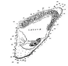 The atoll has a central lagoon, accessible by boat only by way of a channel 100 yards (91 m) wide located in the southwest, between Pandora and Westward Islets.[39] It has a maximum depth of 52 feet (16 m) and its bottom consists of sand and coral.[40] Whirlpools in the lagoon are common, caused by caves that drain the water from the lagoon into the ocean.[20]