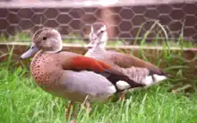 A number of other species called ducks are not considered to be 'true ducks', and are typically placed in other subfamilies or tribes. The whistling ducks are assigned either to a tribe (Dendrocygnini) in the subfamily Anatinae or the subfamily Anserinae,[15] or to their own subfamily (Dendrocygninae) or family (Dendrocyganidae).[9][16] The freckled duck of Australia is either the sole member of the tribe Stictonettini in the subfamily Anserinae,[15] or in its own family, the Stictonettinae.[9] The shelducks make up the tribe Tadornini in the family Anserinae in some classifications,[15] and their own subfamily, Tadorninae, in others,[17] while the steamer ducks are either placed in the family Anserinae in the tribe Tachyerini[15] or lumped with the shelducks in the tribe Tadorini.[9] The perching ducks make up in the tribe Cairinini in the subfamily Anserinae in some classifications, while that tribe is eliminated in other classifications and its members assigned to the tribe Anatini.[9] The torrent duck is generally included in the subfamily Anserinae in the monotypic tribe Merganettini,[15] but is sometimes included in the tribe Tadornini.[18] The pink-eared duck is sometimes included as a true duck either in the tribe Anatini[15] or the tribe Malacorhynchini,[19] and other times is included with the shelducks in the tribe Tadornini.[15]