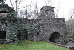 The furnace stack, of local stone, is intact to its full height of 29 feet, but the hearth has been removed. It was powered from a leat from the River Duddon and was blown (at least latterly) by blowing cylinders, described by Morton.[10] The bridge, leading to the charging platform, has rooms under it used for workers' housing. The charcoal barn is 100 feet long,[11] and the iron ore store also survives. The site was investigated archaeologically in the 1980s, but only interim reports from this have been published.[12]