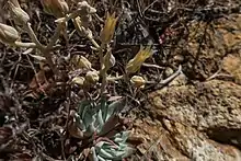 From the rosette bolts an erect stem, which is a caudex topped with a multi-branched inflorescence. The stem and branches may be dark to very light and almost white in color. Each branch may be several centimeters long and bear two to eight flowers. The flowers are very pale yellow to reddish-yellow and have sharply pointed petals one to one and a half centimeters long. The keel is tinged a dark yellow to red. The plant flowers from May to June or July.[2][3]