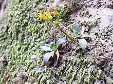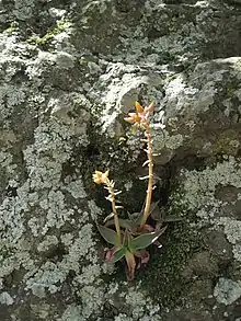 Dudleya cymosa subsp. marcescens is a species of summer-deciduous succulent plant known commonly as the marcescent dudleya or marcescent liveforever. Throughout the months of spring, it is characterized by a bloom of small, bright-yellow flowers with 5 petals, tinged with orange or red. It is a leaf succulent with a basal rosette, with the foliage withering in summer, going completely leafless, a neotenous trait in the genus.[2] This species is endemic to the exposed volcanic rock of the Santa Monica Mountains in California, being found on shady slopes and outcroppings.[3] It differs from its local congeners with its deciduous habit, slender caudex, and narrower leaf shape, although it is superseded in some of these characteristics by Dudleya parva, growing 13 km to the north, which has even narrower leaves and is quicker to lose them.[4] Because of its restricted distribution and small size, it is vulnerable to habitat degradation and disturbance from acts of graffiti and rock climbers.[5] It is listed as threatened by the United States Fish and Wildlife Service.[6]