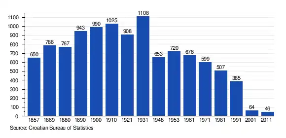 According to the 1991 census,[4] 91.17% of the village population were ethnic Serbs (351/385), 1.30% were ethnic Croats (5/385), while 7.53% were of other ethnic origin (29/385).