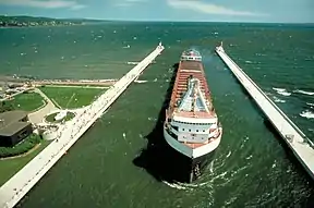 ![]() SS Tarantau entering the Duluth Ship Canal from the lake. The two entrance lights can be seen at the end of the piers, while the museum building is at the left. | |