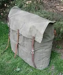 A Duluth pack is a specialized type of backpack made of heavy canvas, leather, and/or cordura nylon. The packs are a traditional portage pack which are nearly square in order to fit easily in the bottom of a canoe. The simplest and most traditional Duluth pack consists of a single large envelope which is closed by straps and roller buckles. The pack is carried by two shoulder straps, and sometimes a tumpline worn over the top of the head.