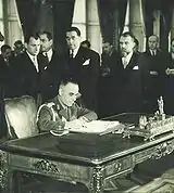 Colonel Dămăceanu participated in the August 23, 1944 coup d'état led by King Michael I against the government of Marshal Ion Antonescu. He organized and coordinated the military actions and resistance in Bucharest. On August 29, he was promoted to brigadier general. By the end of August 1944, he travelled to Moscow with a Romanian delegation; they were received by Soviet Foreign Minister Vyacheslav Molotov on August 30 or 31.[5] On September 12, 1944, General Dămăceanu was one of the plenipotentiary signatories of the Armistice Agreement between Romania and the Soviet Union (the other signatories were Lucrețiu Pătrășcanu, Ghiță Popp, and Barbu Știrbey on the Romanian side, and Rodion Malinovsky on the Soviet side).