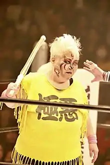Kaoru Matsumoto (松本 香, Matsumoto Kaoru), better known by her ring name Dump Matsumoto (ダンプ松本, Danpu Matsumoto), is a semi-retired Japanese professional wrestler. She came to prominence as one of the leading female wrestlers in All Japan Women's Pro-Wrestling during the 1980s. The longtime leader of the stable Gokuaku Domei — which included Crane Yu, Condor Saito and Bull Nakano — she was one of the main rivals of the popular tag team Crush Gals. Their long running feud would become extremely popular in Japan during the 1980s, with their televised matches resulting in some of the highest rated in Japanese television as well as the promotion regularly selling out arenas.[1]