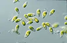 Dunaliella is a biflagellate green algal and mostly marine protist that, in its vegetative motile form and depending on the species, exhibits ellipsoid, ovoid, and cylindrical shapes that sometimes taper at the posterior end.[2] It can also exhibit more circular shapes in its vegetative non-motile cyst state.[8] The cells are typically 7–12 μm in length, though there are few species larger or smaller than this. D. salina, for instance is larger in size, typically ranging from 16–24 μm.[9] Sizes of the cells vary with environmental conditions such as light, salinity, and nutrient availability .[10]