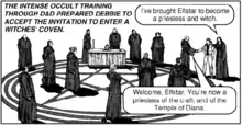 The concept of Dungeons & Dragons as Satanic was linked to the concept of Satanic ritual abuse, in that both presumed the existence of large, organized Satanic cults and societies.[7] Sources such as the Dark Dungeons tract from Chick Publications portray D&D as a recruitment tool for these organizations.[8][9][10][11][12]