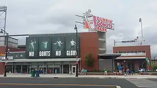 Dunkin' Donuts Park is a 6,121-seat baseball park in Hartford, Connecticut. It is the home field of the Hartford Yard Goats of the Double-A Northeast. The stadium has a total capacity of 6,850 people, including standing room, which was reached numerous times during its inaugural season of 2017. It was planned to open for the 2016 season on April 7, but numerous constructions delays postponed this opening and forced the Yard Goats to play the entire season on the road. The stadium opened in time for the team's 2017 home opener on April 13.[6]