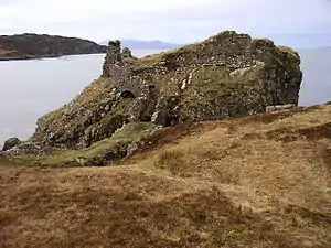Dunscaith Castle also known as Dun Scaich, Dun Sgathaich Castle and Tokavaig, is a ruined castle on the coast of the Isle of Skye, in the north-west of Scotland. It is located in the Parish of Sleat, in the Highland council area, and in the former county of Inverness-shire, at grid reference NG595120. Also called "Fortress of Shadows", it is named after and was the home of the warrior maiden Scáthach.[1][2] It is protected as a scheduled monument.[3]