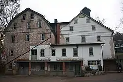 Durham Mill and Furnace is a historic grist mill located in Durham Township, Bucks County, Pennsylvania. The mill was built in 1820, on the foundations of Durham Furnace. The furnace was built in 1727 and remained in operation for 70 years. It produced pig and bar iron and during the American Revolution cannons, ballshot, and other military equipment. One of its managers was Col. George Taylor (c. 1716–1781), a signer of the Declaration of Independence. The mill building is a three-story, stone structure with the overshot wheel located inside. Attached to it is a large, brick gambrel roofed warehouse added in 1912. At that time, the post office opened at the mill, the second oldest post office in the United States; the Durham Post Office was founded in 1723. The mill was owned by Congressman Reuben Knecht Bachman (1834–1911) in the late-19th and early-20th century. The mill remained in commercial operation until 1967.[2]