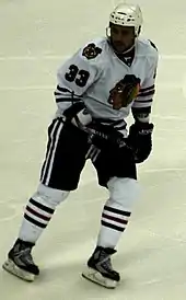 Dustin Byfuglien (/ˈbʌflɪn/ BUF-lin;[1] born March 27, 1985) is an American former professional ice hockey player. He previously played for the Chicago Blackhawks, Atlanta Thrashers and Winnipeg Jets. Drafted as a defenseman, he has played both forward and defense in his career, although he has generally played defense in recent years. Byfuglien helped Chicago win the Stanley Cup in 2010. Byfuglien is the first black American-born player to win the Stanley Cup.[2]