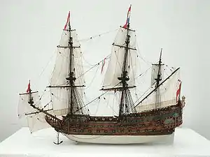 ![]() Model (scale 1:87) of De Zeven Provinciën, built by Herbert Tomesen for the Bataviawerf in the Netherlands | |