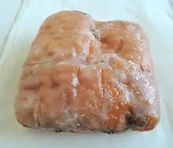 The dutchie is a Canadian doughnut popularized by the Tim Hortons chain.[1] It is a square, yeast-lifted doughnut containing raisins that is coated with a sugary glaze. The dutchie was one of two original baked goods (along with the apple fritter) that had been available on Tim Hortons' doughnut menu since the chain's inception in 1964.[2] In 1991, the Toronto Star reported that the dutchie and apple fritter were the chain's most popular type of fried dough, and that readers rejected the paper's contrarian taste-test results.[3]