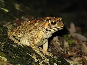 The Asian common toad has been described as one of Australia's “10 most unwanted” species, and “potentially more damaging than the cane toad”.[20] It may cause serious ecological problems due to “competition with native species, its potential to spread exotic parasites and pathogens and its toxicity”.[21] Like cane toads, the Asian common toad secretes toxins from glands in their backs to deter predators. These toxins would beyond reasonable doubt severely affect native predators, such as snakes, goannas[22] and quolls.[17]