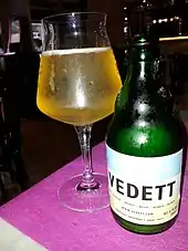 The Vedett, a pilsener, was created in 1945 by Albert Moortgat, Jan's son. Since 2003, Vedett has been relaunched as a trendy luxury lager, aimed at young customers in upscale urban bars. Vedett currently has a marketing campaign that gives customers the chance to have photos of themselves placed on the labels of bottles.[15]