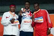 The start of his 2011 season saw him take a fourth consecutive national title over 60 m with a European-leading time.[194] At the 2011 European Athletics Indoor Championships the following month he was beaten to the line by Obikwelu, although he was pleased with the silver medal as he had changed his training to focus towards the 100 m for that season.[195] Four straight wins on the Brazilian Athletics Tour came at the beginning of his outdoor season in May, including a season's best of 10.01 seconds,[196] and he took his fifth national title at the British trials.[197] At the 2011 World Championships he reached the 100 m semi-finals but fell foul of the IAAF's new false start rule: he twitched in his blocks and was immediately disqualified.[198]