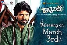 Dwaraka is a 2017 Indian Telugu-language comedy-drama film directed by Srinivas Ravindra (MSR), produced by Pradyumna Chandrapati and Ganesh Penubotu, under Legend Cinema, and is presented by R. B. Choudary under the banner Super Good Films.[2] It features Vijay Deverakonda and Pooja Jhaveri in the lead roles while Prakash Raj, Prudhviraj and Murali Sharma appear in crucial roles. The movie was set to release on November 2016 but due to demonitisation was released on March 3, 2017, with premiers in USA on March 2. The movie received poor word of mouth and failed domestically and overseas at the box office.[3]