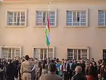 Every Saturday in this school three students raise the Flag of Kurdistan and the principal with physical education teacher perform the raising of the flag, with performing the Kurdish National Anthem[2] Ey Reqîb, the picture shows raising of the flag at the school in 2013 and 2014.