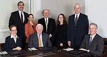The commission consulted with the fundraising consulting firm Odell, Simms & Lynch (OSL) in February 2011 to develop a fundraising strategy. Representatives of the Eisenhower family met with OSL in March 2012, during which time the Eisenhowers expressed their concern with the fundraising campaign. OSL, however, argued that the legacy organizations would benefit from the successful completion of the memorial.[98] OSL crafted a fundraising plan for the commission, and outreach to 200 major donors (defined as those individuals of high net worth) began in 2013.[99] The commission targeted "individuals with a direct link to President Eisenhower and his legacy; organizations and individuals with an interest in the E-Memorial educational component; and friends and admirers of Frank Gehry and his work" in key markets such as California, Georgia, Kansas, New York, Texas, and Washington, D.C.[100] Working with retired Marine Corps General Paul X. Kelley and former Republican National Committee chairman Frank Fahrenkopf, both members of the Eisenhower Memorial Commission's advisory board, OSL also reached out to members of the Giving Back Fund, all of whom are capable of donating more than $10 million. As of March 2013, the Eisenhower Memorial Commission had already raised $1.7 million in donations and pledges.[100][17][lower-alpha 6] Once the memorial design was approved, the commission said it was ready to move forward on fundraising outreach to corporations, foundations, and international organizations and foreign governments.[99]