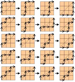 Figure 4 illustrates the situation for n = 3. Each of the 20 possible monotonic paths appears somewhere in the table. The first column shows all paths of exceedance three, which lie entirely above the diagonal. The columns to the right show the result of successive applications of the algorithm, with the exceedance decreasing one unit at a time. There are five rows, that is, C3 = 5, and the last column displays all paths no higher than the diagonal.