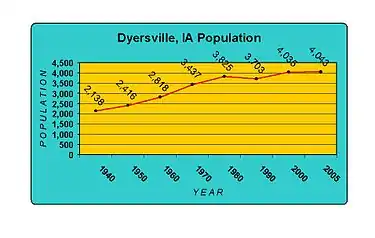 Dyersville is a city in eastern Delaware County and western Dubuque County in the U.S. state of Iowa. It is part of the Dubuque, Iowa, Metropolitan Statistical Area. The population was 4,477 at the time of the 2020 census, up from 4,035 in 2000.[2]
