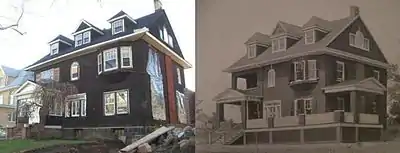 In 1895, Johnson, very much aware of the successful Bensonhurst-by-the-Sea, built three homes. His home was on the southwest corner of 11th Avenue and 82nd Street (across the Avenue from the home of his mother), Albert Edward Parfitt's home was on 82nd Street next to Johnson's, and the last, closest to Tenth Avenue, was the home of Arthur S. Tuttle who was Assistant Engineer of The Water Supply of The City Works Department of The City of Brooklyn. Parfitt was the architect of these three homes. Johnson's house burned down before 1900, Parfitt's was demolished by a developer in 1928 and replaced with seven, run-of-the-mill, fully detached, single-family homes, and Tuttle's house was remodeled over 10 years ago and clad in bright-white and sky-blue brick.[10]